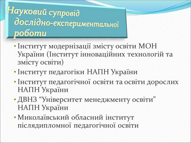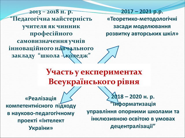 Миколаївський ліцей експериментальний навчальний заклад всеукраїнського рівня «Академія дитячої творчості», авторська школа Ганни Матвєєвої під керівництвом Національної академії педагогічних наук України працює над науково-дослідною темою «Педагогічна майстерність вчителя, як чинник професійного самовизначення учнів інноваційного навчального закладу «школа-коледж».